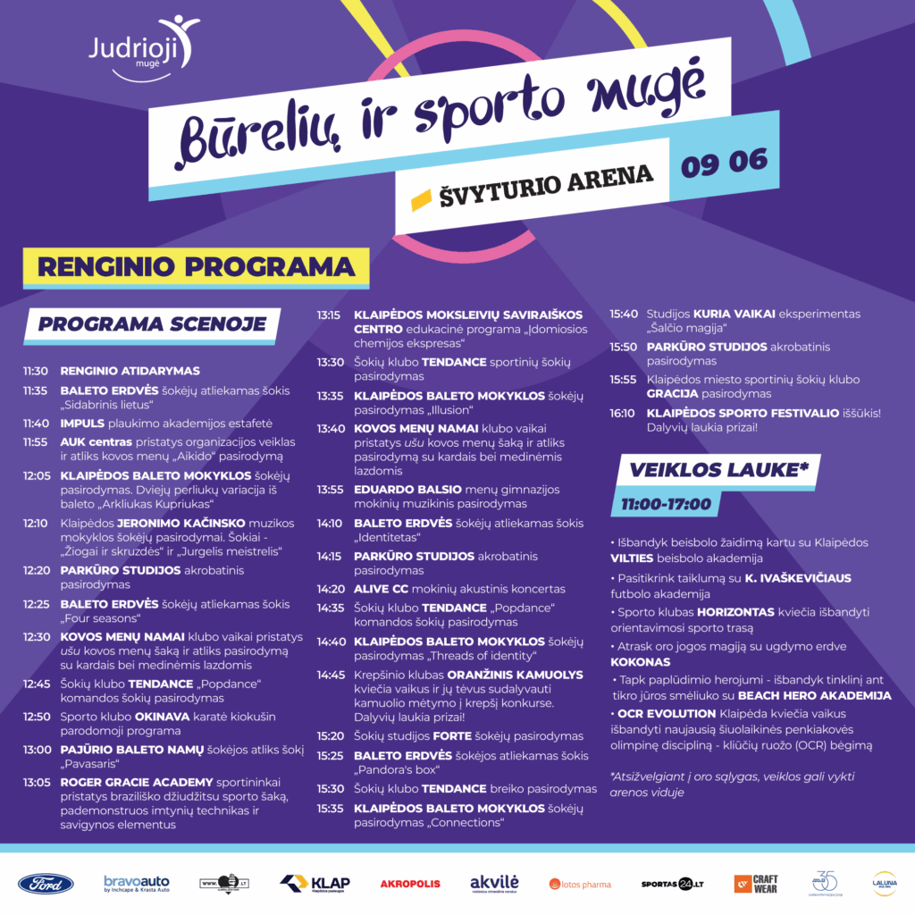 Visą dieną lauks parodomoji programa, pasirodymai scenoje, konkursai, žaidimai ir pramogos tiek arenoje, tiek lauko erdvėse.